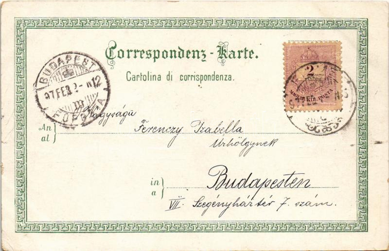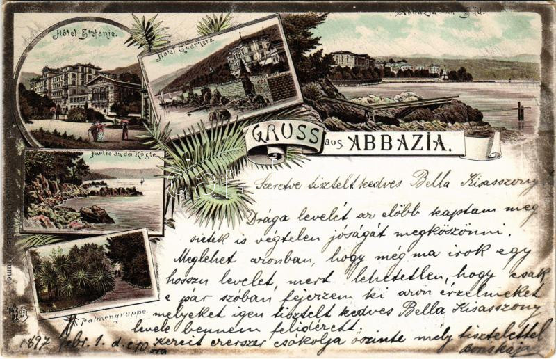 1897 (Vorläufer!) Abbazia, Opatija; Hotel Stefanie, Hotel Quarnero, Partie an der Küste, Palmengruppe, Abbazia von Süd. O.Z.M. Art Nouveau, floral, litho (EB)