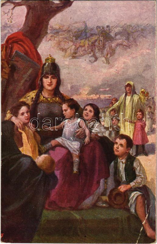 Fölszárítom az özvegyek és árvák könnyeit! A m. kir. honvédelmi minisztérium hadsegélyező hivatala kiadása / WWI Austro-Hungarian K.u.K. military art postcard, support fund (EB)