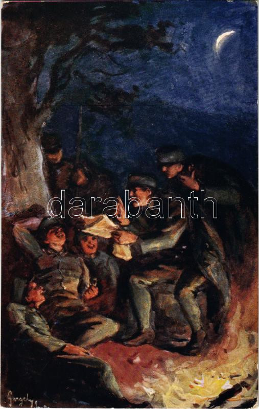 Otthoni hírek a tábori tűznél / Heimatsnachrichten beim Lagerfeuer / WWI Austro-Hungarian K.u.K. military art postcard, news from home. Rotophot Nr. 690. s: Gergely Imre (EK)
