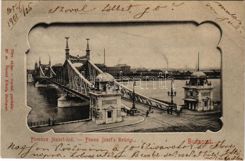 1901 Budapest, Ferenc József híd. Divald Károly 20. sz. https://www.darabanth.com/hu/468-Gyorsarveres/468.0/Kepeslapok/Magyarorszag~2000005/1901-Budapest-Ferenc-Jozsef-hid-Divald-Karoly-20-sz~II3166433