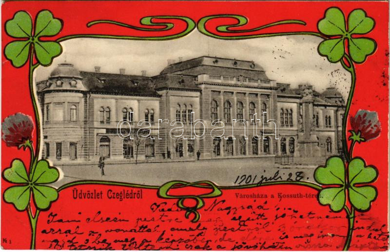 Leírás: 1901 Cegléd, Városháza a Kossuth téren. Sebők Béla kiadása. Szecessziós litho keret lóherékkel / Art Nouveau, litho frame with clovers