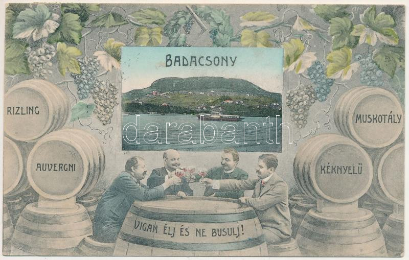 Leírás: 1912 Badacsony, Vígan élj és ne búsulj! Montázs boros hordókkal, szőlőkkel és gőzhajóval. Löwy B. kiadása (EK)