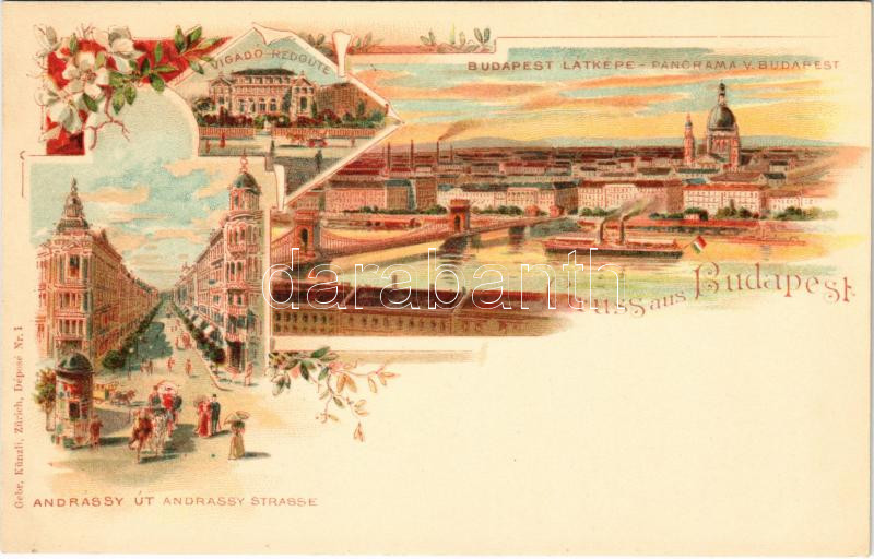 Leírás: Budapest, Vigadó, Lánchíd, Andrássy út. Gebr. Künzli Nr. 1. Art Nouveau, floral, litho
