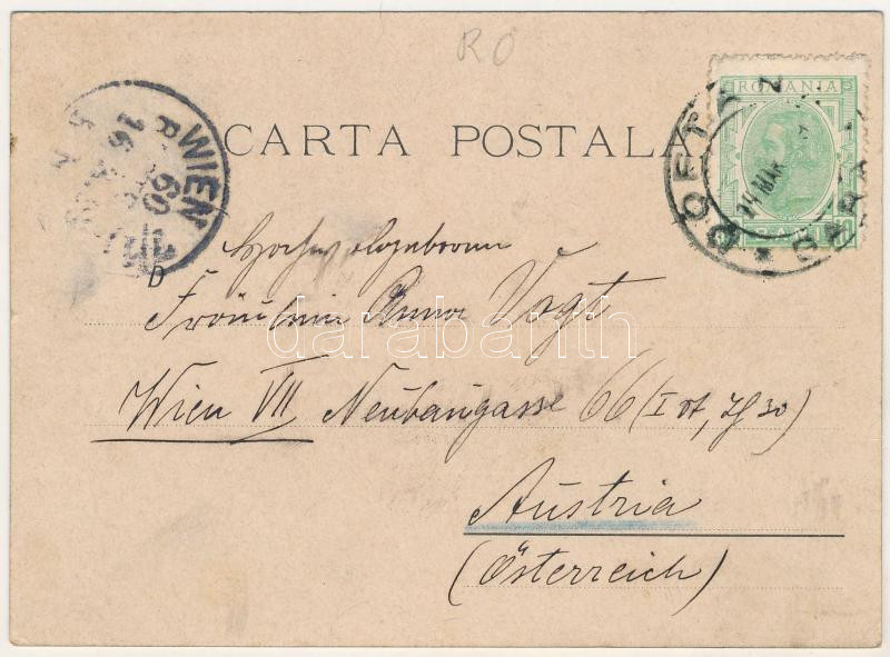 1899 (Vorläufer) Campina, Castelul Iulia Hasdeu, Primaria, Malu Prahovi, Villa Lahovari, Villa Cantacuzino, Villa Seicar, Villa Gross / castle, town hall, Romanian folklore, oil tower, oil plant, villas. Art Nouveau, floral (9 cm x 12,4 cm) (fa)