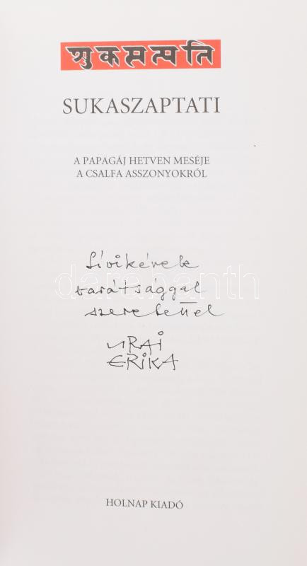Sukaszaptati. A papagáj hetven meséje a csalfa asszonyokról. Szanszkrit eredetiből fordította, azt előszót és a jegyzeteket írta: Töttössy Csaba. A versek műfordítója Tellér Gyula. Az illusztrációk Urai Erika munkái. Az illusztrátor, Urai Erika (1930) grafikusművész által Mohás Lívia (1928-2024) pszichológus, József Attila-díjas író részére DEDIKÁLT példány. Bp., 2007, Holnap. Kiadói egészvászon-kötés.