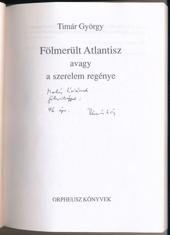 Tímár György: Fölmerült Atlantisz avagy a szerelem regénye. + Angyalaink alusznak. Mind a két kötet a szerző, Timár György (1929-2003) író, költő, kritikus, műfordító, újságíró, humorista által Mohás Lívia (1928-2024) pszichológus, József Attila-díjas írónak DEDIKÁLT példányok. hn.-Bp., 1996-1998, Orpheusz - Fekete Sas. Kiadói papírkötés.