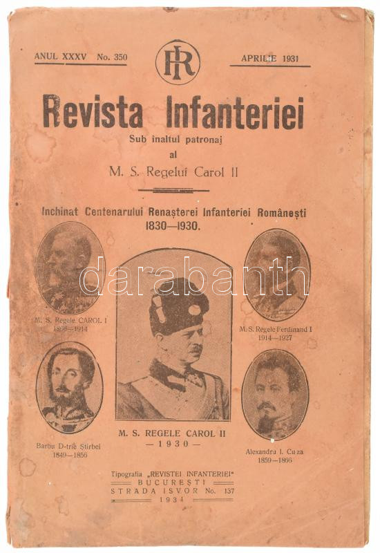 [Román tüzérségi folyóirat] Revista Infanteriei 1931. XXXV. No 350. 208p. a szöveg közötti egészoldalas táblákkal, kihajtható térkép melléklettel. Négány lap sérült / Romanian artillery magazine with some pages damaged