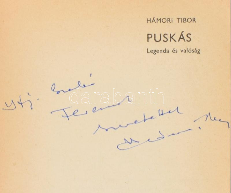 Hámori Tibor: Puskás. Legenda és valóság. A szerző által DEDIKÁLT példány. Bp., 1982, Sportpropaganda Vállalat. Kiadói papírkötésben, kopott borítóval.