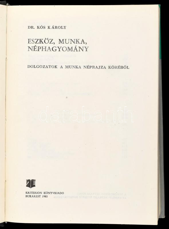 Dr. Kós Károly: Eszköz, munka, néphagyomány. Dolgozatok a munka népraj... https://www.darabanth.com/hu/468-Gyorsarveres/468.0/Konyvek/Konyvek-Tarsadalomtudomany~1500034/Dr-Kos-Karoly-Eszkoz-munka-nephagyomany-Dolgozatok-a-munka-neprajza-korebol-Bukarest-1980-~II3159081