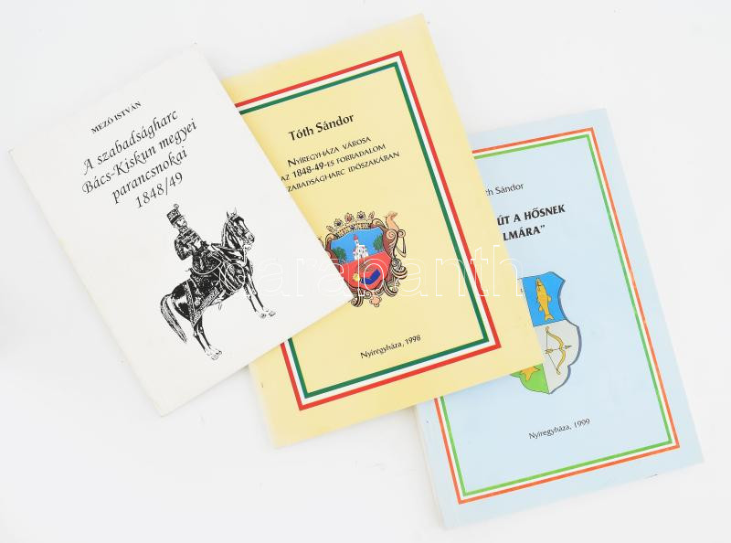 3 db dedikált könyv az 1848-49-es forradalomról: Tóth Sándor: Nyíregyháza városa az 1848-49-es forradalom és szabadságharc időszakában. Nyíregyháza, 1998, Fegyveres Erők és Rendvédelmi Szervek Nyugdíjas Klubja. Kiadói papírkötés. + ,,Koszorút a hősnek sírhalmára". (Tanulmányok 1848/49-1998/99). Nyíregyháza, 1999, Nyíri Honvéd Egyesület. Kiadói papírkötés. Megjelent 1000 példányban. Mindkét kötet a szerző, Tóth Sándor által Katona M. István részére dedikált! + Mező István: A szabadságharc Bács-Kiskun megyei parancsnokai 1848/49. Kecskemét, 2004, Bács-Kiskun Megyei Önkormányzat. Kiadói papírkötés. Megjelent 500 példányban. A szerző által dedikált példány!