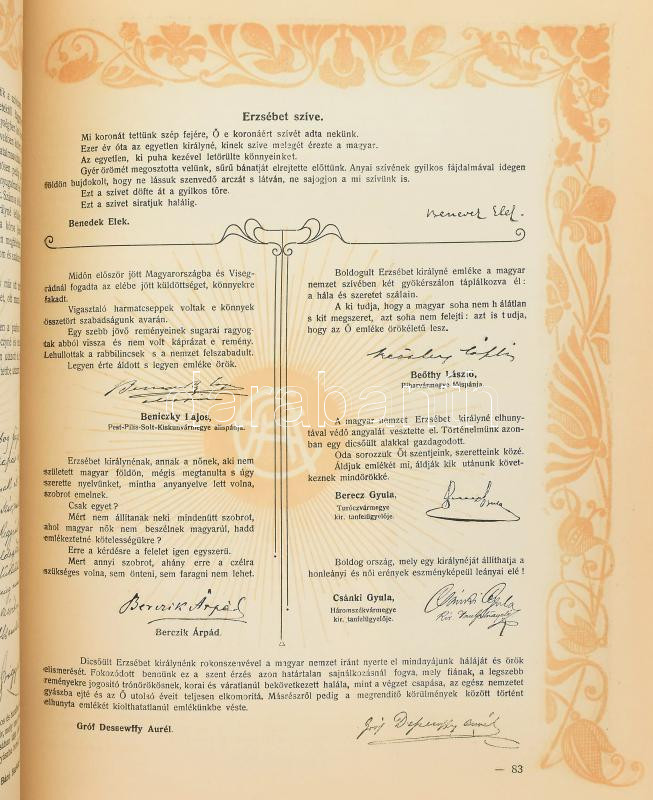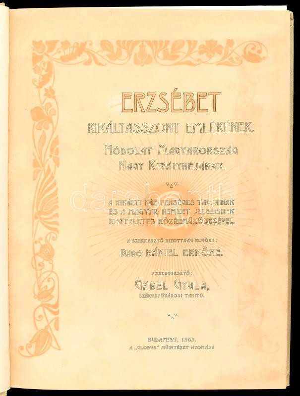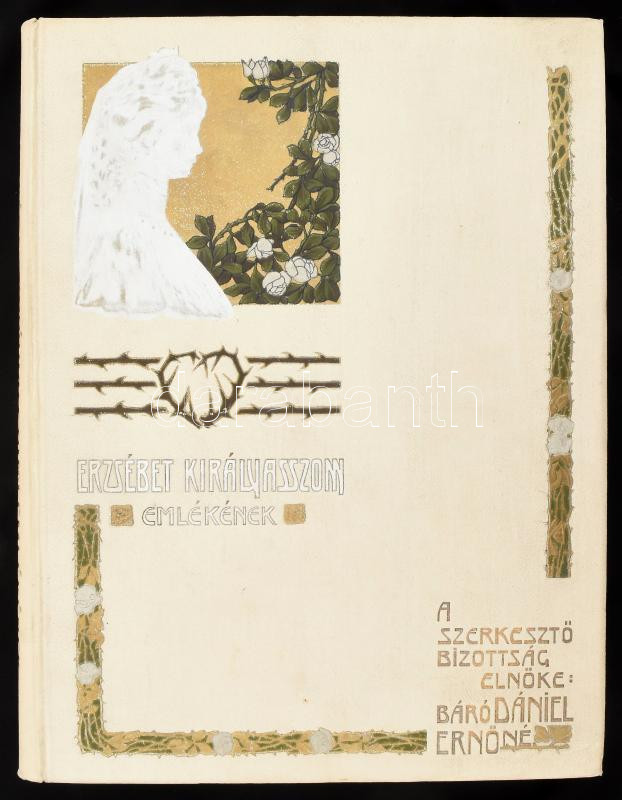 Erzsébet királyasszony emlékének. Hódolat Magyarország nagy királynéjának. A királyi ház fenséges tagjainak és a magyar nemzet jeleseinek kegyeletes közreműködésével. A szerkesztő bizottság elnöke: Dániel Ernőné. Főszerkesztő Gábel Gyula. Bp., 1905, Globus, 176 p. Gazdag szövegközti és egészoldalas képanyaggal. Kiadói aranyozott, festett vajszínű egészvászon-kötésben, Gottermayer-kötés. Első lap kitépve, de megvan, kopottas állapotban.