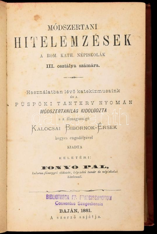 Fonyó Pál: Módszertani hitelemzések a rom. kath. népiskolák III. osztálya számára. Baja, 1881., Szerzői, VIII+480 p. Aranyozott egészvászon kötésben, aranyozott lapélekkel, kis kopással, ex librissel