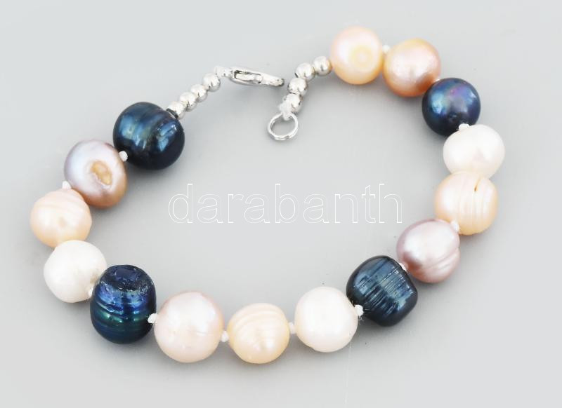 Leírás: Exkluzív, nagy méretű tenyésztett gyöngy karlánc, fehér, púder rózsaszín és irizáló kékes színű, h: 19 cm