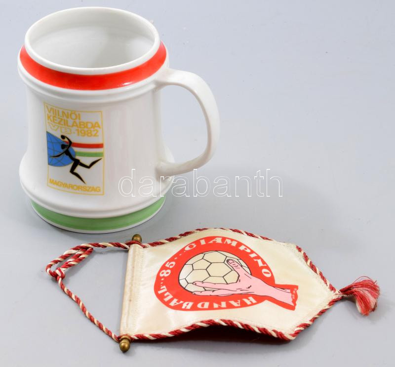 Leírás: Hollóházi "VIII. Női Kézilabda VB 1982 - Magyarország" porcelán korsó, m: 12,5 cm + 1985 "Handball 85 Ciampino" asztali zászló, 14x10 cm