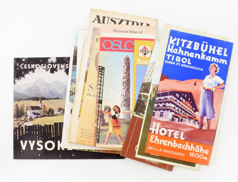 16 db vegyes külföldi utazási, idegenforgalmi prospektus, közte 1929-es, magyar nyelvű Ausztria-prospektus; Kitzbühel-Hahnenkamm-Tirol; Magas-Tátra; stb.