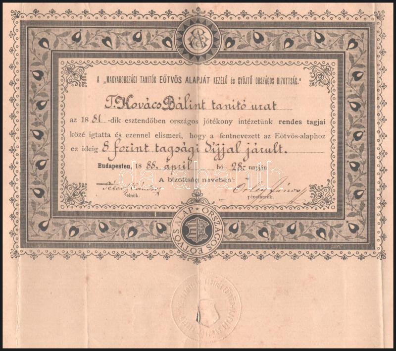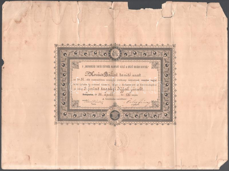 1888 Magyarországi Tanítók Eötvös alapját Kezelő és gyűjtő Országos Bizottság által kiállított oklevél, Péterfy Sándor aláírásával, szakadásokkal, hajtott