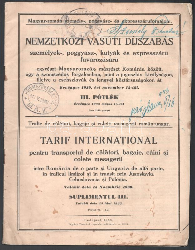 Leírás: 1933 Nemzetközi vasúti díjszabás magyar-román személy-, poggyász- és expresszáruforgalom