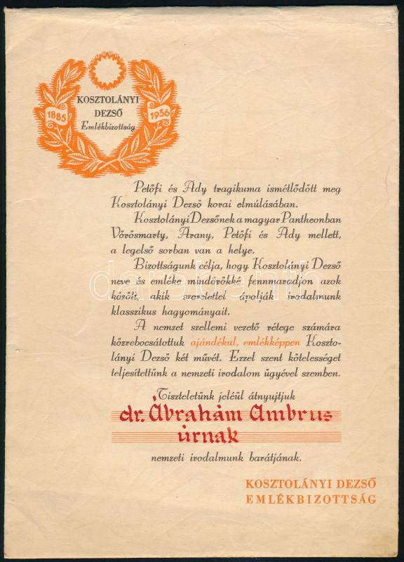 1936 A Kosztolányi Dezső Emlékbizottság által kiadott papírboríték, névre szóló, Dr. Ábrahám Ambrus (1893-1989) zoológus, ideghisztológus, az MTA tagja részére (üres), 21,5x15 cm