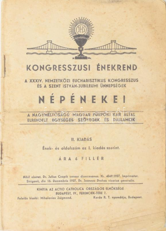 1938 Kongresszusi énekrend. A XXXIV. Nemzetközi Eucharisztikus Kongresszus és a Szent István-jubileumi ünnepségek népénekei. Bp., 1938, Actio Catholica Kongresszusi Főbizottsága (Korda Rt.-ny.), 35 p. Kiadói tűzött papírkötés, gerincen apró sérüléssekel, borítón apró foltokkal és szakadásookal, részben foltos lapokkal, egyik lapon szakadással.