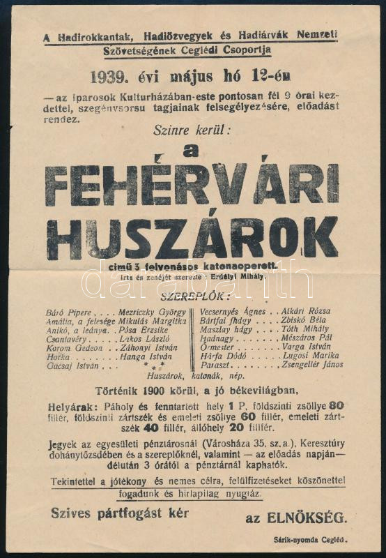 1939 Fehérvári huszárok katonaoperett előadás röplapja16x24 cm https://www.darabanth.com/hu/468-Gyorsarveres/468.0/Mutargy-papirregiseg-egyeb/Nyomtatvanyok~2000104/1939-Fehervari-huszarok-katonaoperett-eloadas-roplapja16x24-cm~II3161441