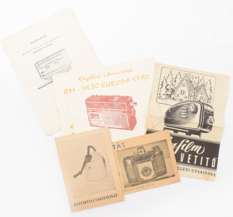 Leírás: 5 db használati útmutató: Diafilm vetítő, Pajtás fényképezőgép, stb. Vegyes állapotban.
