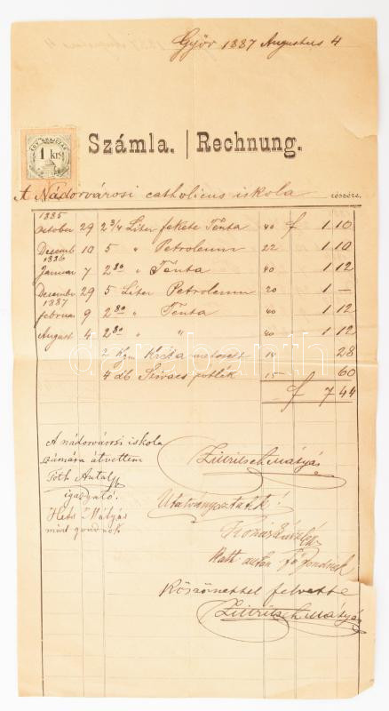 1887 Győr, Zittritsch Mátyás kereskedő által a nádorvárosi katolikus iskola részére kiállított számla (benne tinta, petróleum, kréta, szivacs), aláírásokkal, 1kr okmánybélyeggel