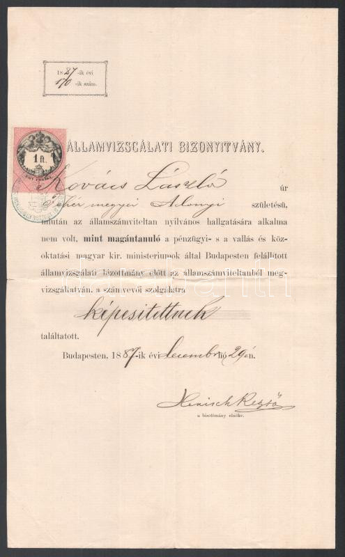 Leírás: 1887 Kézdi-Kovács László (1864-1942) festőművész, műkritikus államvizsgálati bizonyítványa, egy forint okmánybélyeggel.