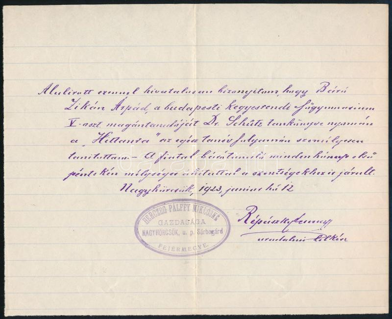 Leírás: 1923 Nagyhörcsök, báó Czikann-Zichy Móric Árpád hittan tanulmányi igazolása