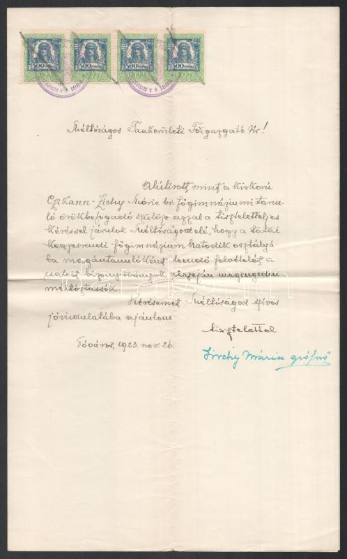 1923 Tóváros, Gróf Zichy Mária aláírt levele nevelt fia iskolai felvét... https://www.darabanth.com/hu/468-Gyorsarveres/468.0/Mutargy-papirregiseg-egyeb/Okmanyok~1000021/1923-Tovaros-Grof-Zichy-Maria-alairt-levele-nevelt-fia-iskolai-felvetele-targyaban~II3161509