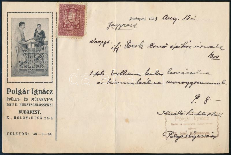 Leírás: 1933 Bp. X. kerület, Polgár Ignác épület és műlakatos fejléces számla, 22×15 cm