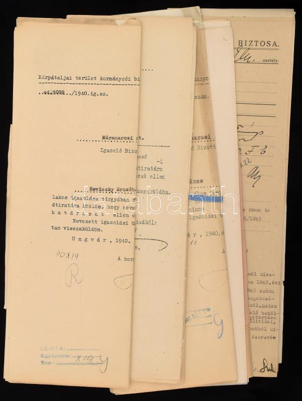 Leírás: 1940 Kárpátaljai terület kormányzóságának iratai: igazolási okiratok, stb kb 20 db