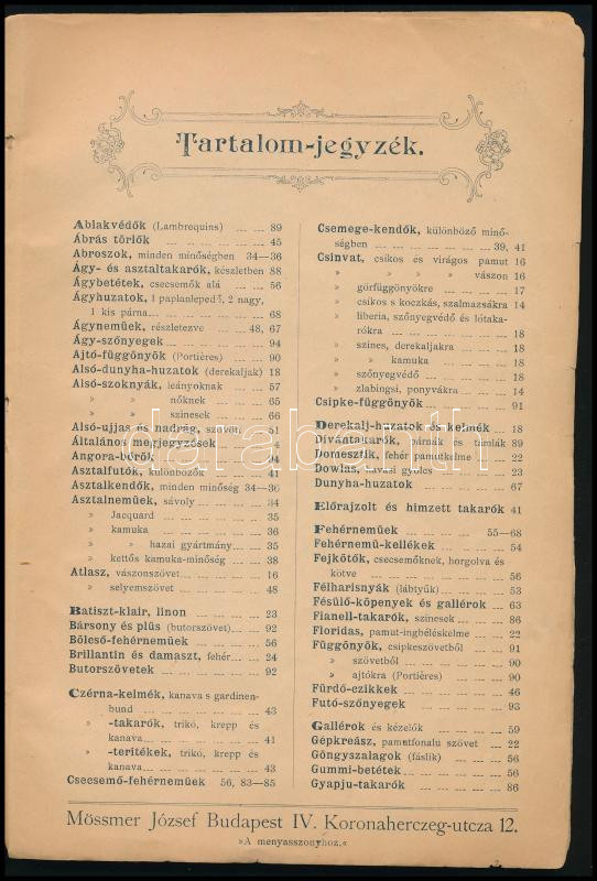 1896 Millennium-kiállítási árjegyzék Mössmer József "A menyaszonyhoz" vászon, asztalnemű, szövöttáru és kész fehérnemü gyári raktárából. 39. kiadás. Millennium-Ausstellungs-Preiscourant von Leinwanden, Tischzeugen und Wirkwaaren, Fabriksniederlage in Fertiger Wäsche des Josef Mössmer "Zur Braut". Auflage 39. Bp., Posner-ny., 1 (litografált díszcímlap) t.+ 100 p. Gazdag képanyaggal illusztrált, benne a millenniumi kiállítás képeivel és Budapesti látképekkel. Aranyozott félvászon-kötés, gyűrött, kopott borítóval, kissé sérült gerincekkel, a díszcímlapon ceruzás firkával és a szélein kis hiánnyal.