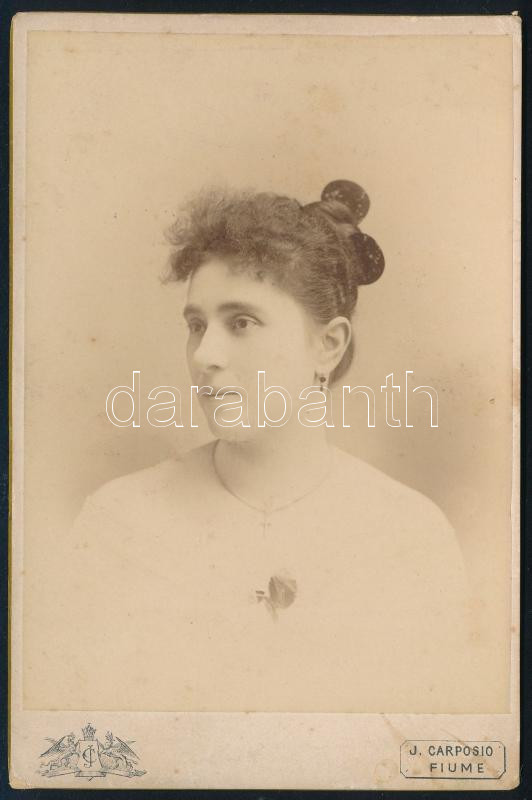 Leírás: cca 1890 Hölgy portréja (Regele Sarolta), kabinetfotó Ilario Carposio fiumei műterméből, a hátoldalon feliratozva, kissé foltos, 16x10,5 cm
