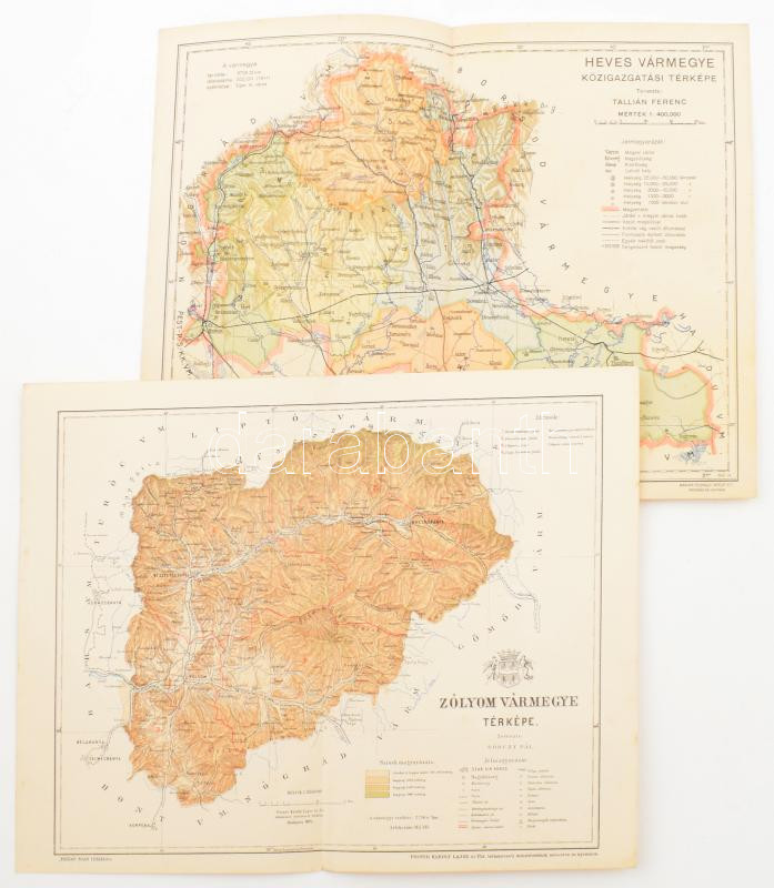 1894 Zólyom vármegye térképe, terv.: Gönczy Pál, 1 : 350.000, Bp., Posner Károly Lajos és Fia, a Pallas Nagy Lexikona melléklete, 23,5x30 cm + 1942 Heves vármegye közigazgatási térképe, terv.: Tallián Ferenc, 1 : 400.000, Magyar Földrajzi Intézet R.T., 23,5x30 cm