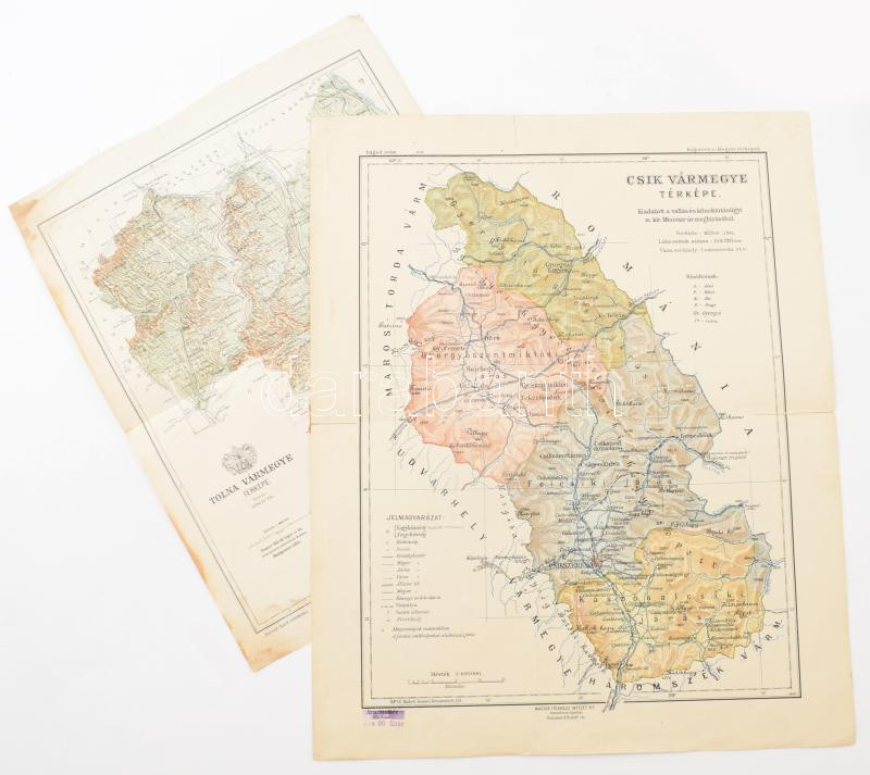 1912 Csík vármegye térképe, Kogutowicz: Megyei térképek, 1 : 400.000, Bp., Magyar Földrajzi Intézet R.T., lapszéli szakadásokkal, javított, 35,5x28,5 cm + 1894 Tolna vármegye térképe, terv.: Gönczy Pál, 1 : 380.000, Bp., Posner Károly Lajos és fia, a Pallas Nagy Lexikona melléklete, kisebb lapszéli sérülésekkel, foltokkal, 30x23,5 cm