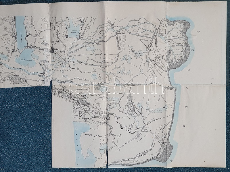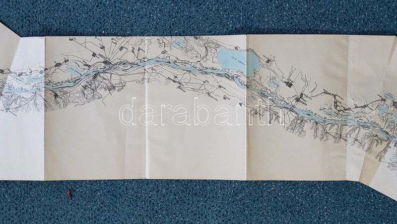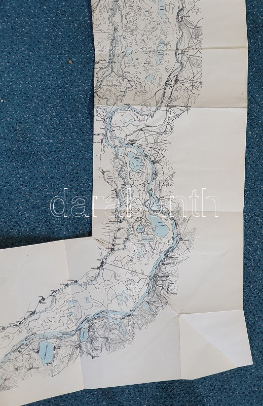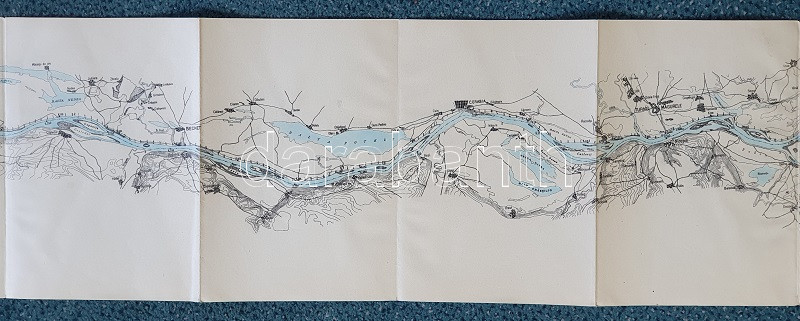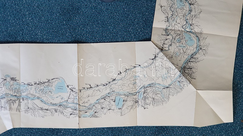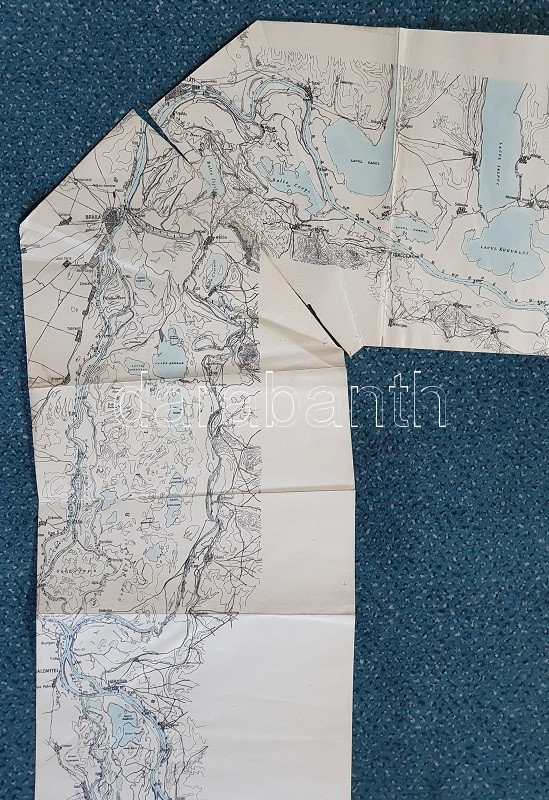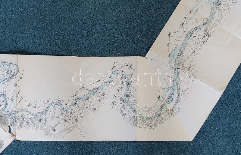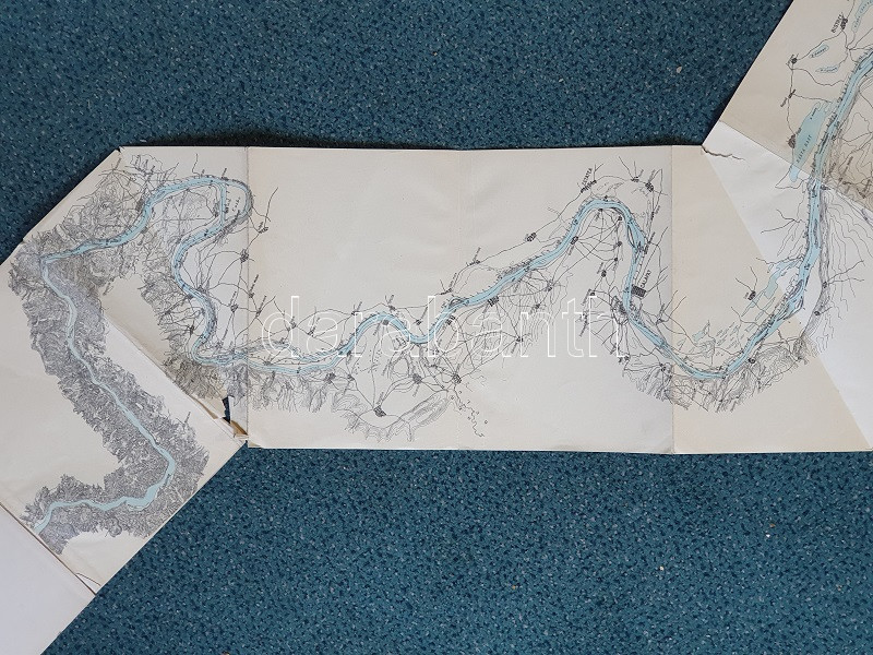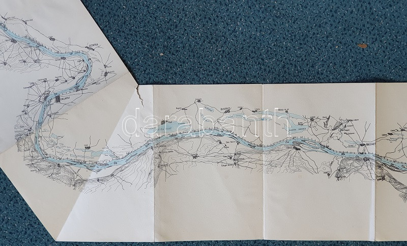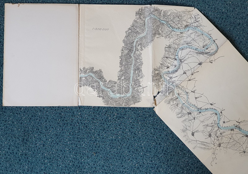 A Duna a Vaskaputól a Fekete-tengerig. (Kézzel színezett hajózási térkép, 1920-as évek) Kiadási hely nélkül, 1920-as évek. Egyetlen, hajtogatott kőnyomat, a horizontális térképlap szélessége: 210 mm, hossza: 3965 mm, méretaránya: 1: 200000. Az Al-Duna kézzel színezett térképén - mely a folyamnak a Vaskaputól a Fekete-tengerig terjedő szakaszát ábrázolja - valamennyi településnév román nyelvű, beleértve a folyó bulgáriai oldalán található bolgár településeket is. Hajózási térképünk feltünteti a holtágakat, a kisebb-nagyobb Duna menti tavakat, és menetében, hajtogatásában a Duna szűkebb, pár tíz kilométeres környezetét ábrázolja a folyó mentén, így a hajtogatott térképlapok maguk is egy kanyargó vonalat alkotnak. A térkép hátoldalán régi tulajdonosi bejegyzés. A térképlapok hiánytalanok, a térkép-leporelló utolsó, a Duna-deltát ábrázoló szakasza elvált a térkép főbb részétől. Poss.: Győry Lajos hajóskapitány. Jó állapotú térképlap, korabeli egészvászon kötésben (Érczhegyi Géza, Budapest).