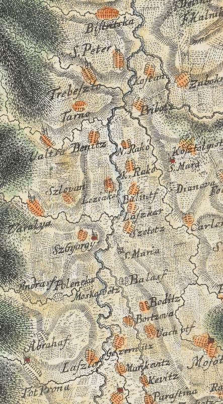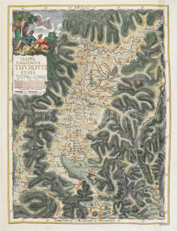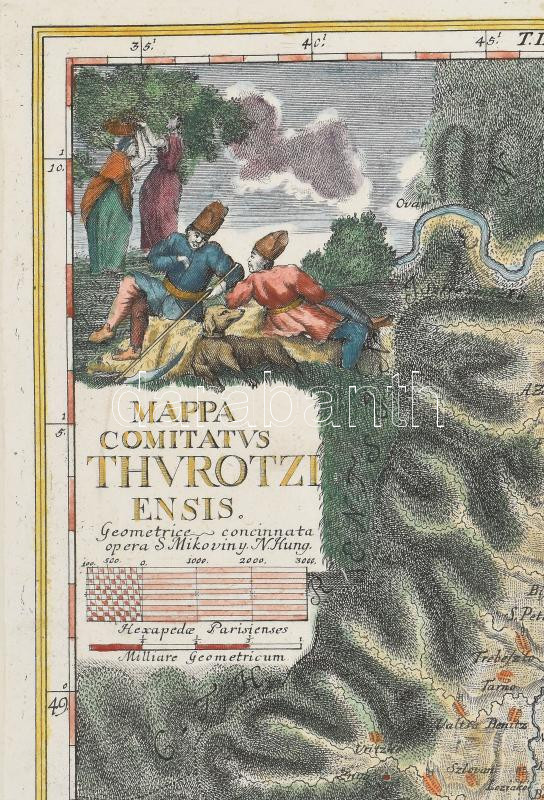 Turóc vármegye rézmetszetű térképe 1735. [M=1:160.000). Címe a kartusban: Mappa Comitatvs Thvrotziensis. Mikoviny Sámuel (1698-1750), nyomán a bécsi Andreas és Joseph Schmuzer metszették. Megjelent: Bél Mátyás (1684-1749): Notitia Hungariae Novae Historico...c. műve második kötetében. [Wien, 1735, P. Straub]. Képméret (díszkerettel): 34,4×25,7 cm. Lapméret: 38,5×30 cm. Restaurált példány