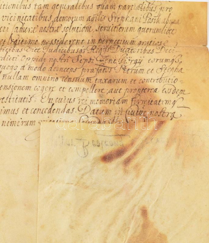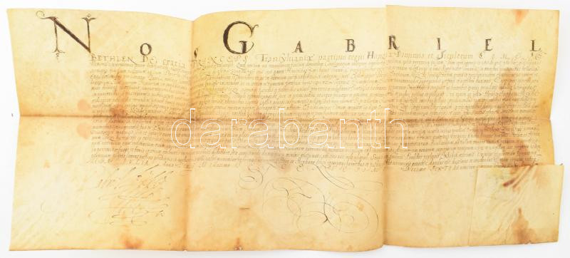 1616 Bethlen Gábor erdélyi fejedelem adománylevele sepsiszentgyörgyi Géczy István marosszéki jobbágytartónak. Pergamen, Bethlen Gábor (1580-1629) autográf aláírásával. Gyulafehérváron kiállítva. Pergamen, hátulján kihirdetési záradékkal. 62x27 cm