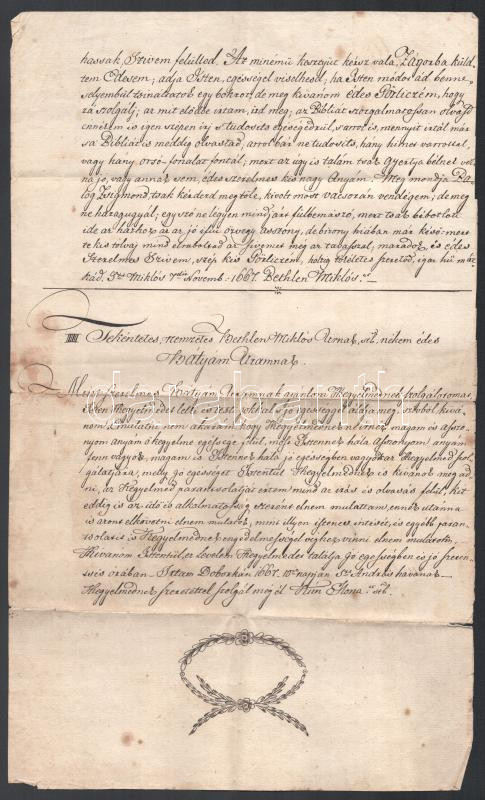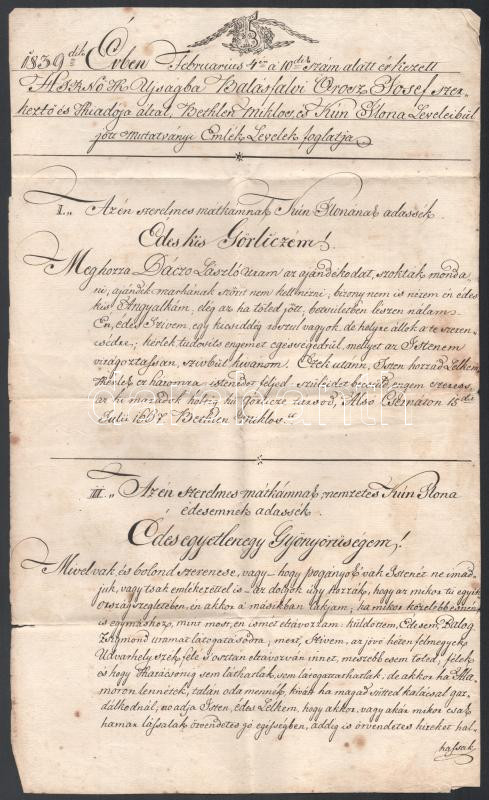 1839 Bethlen Miklós és Kún Ilona 1667-ben kelt leveleinek átirata, két kézzel írt oldal, Kézdi-Kovács László (1864-1942) festőművész, műkritikus és családja hagyatékából, apró szakadásokkal
