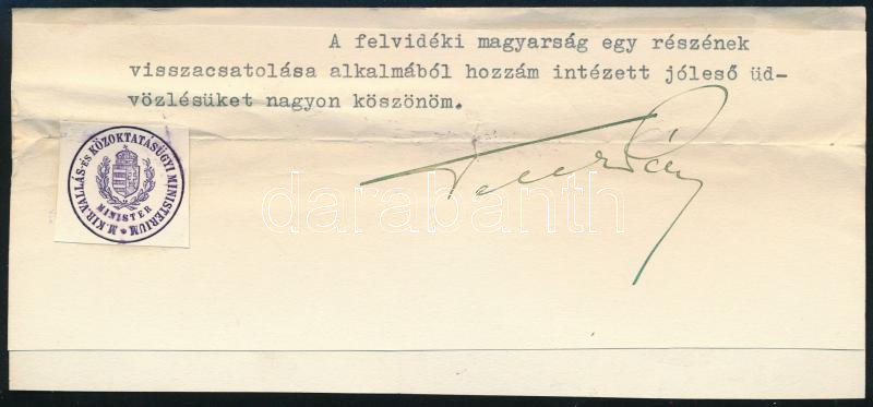 1939 Teleki Pál (1879-1941) kultuszminiszter, későbbi miniszterelnök autográf aláírása a Felvidék visszacsatolásának alkalmából neki küldött üdvözlést megköszönve. Kivágás kartonon