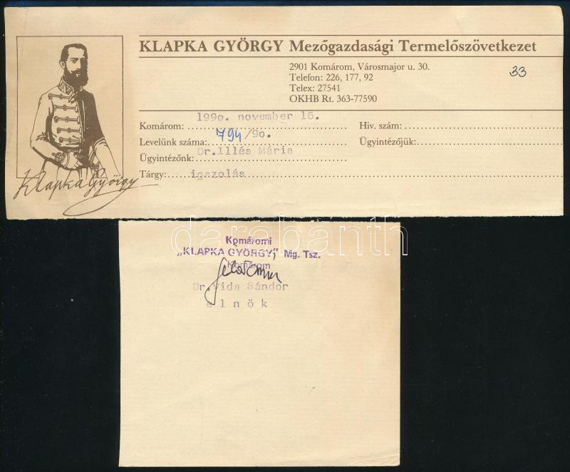 1990 Komárom, Klapka György Mezőgazdasági Termelőszövetkezet 2 db papírja, az egyiken az elnök, Vida Sándor aláírásával és a termelőszövetkezet pecsétjével