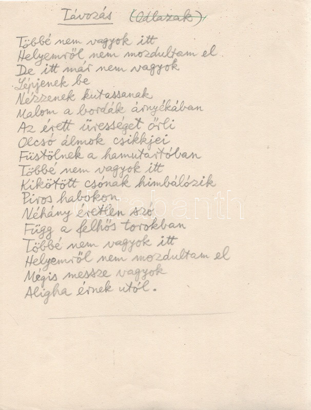 Weöres Sándor (1913-1989) költő, író ,,Távozás" című műfordításának saját kézzel, ceruzával írt teljes kézirata. A fordítás Vasko Popa (1922-1991) román származású szerb költő abszurd költeményéről készült. Kelt: [Budapest, 1967]. Egy levél, mérete: 272x210 mm, egy beírt oldal. Az egyetlen 18 soros versszakból álló költemény Vasko Popa: Ostromlott derű (Európa Könyvkiadó, 1968.) című verseskötetének 16. oldalán, az azonos című, hét abszurd költeményből álló, egyszerre népi és szürreális hatásokat mutató ciklus ötödik verseként jelent meg nyomtatásban. A kézirat szövege megegyezik a nyomtatásban megjelentével. Vasko Popa a legtöbbet fordított szerb költő: 22 idegen nyelven 54 önálló kötete jelent meg. A magyar cím mellett az eredeti szerb cím (Odlazak) zárójelbe téve és zöld tintával áthúzva. Kifogástalan, jó állapotú lap.