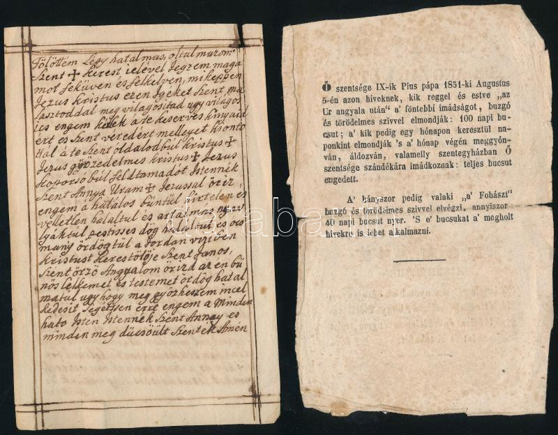 Leírás: cca 1800 Két magyar nyelvű ima. Egy nyomtatott egy kézzel írt.