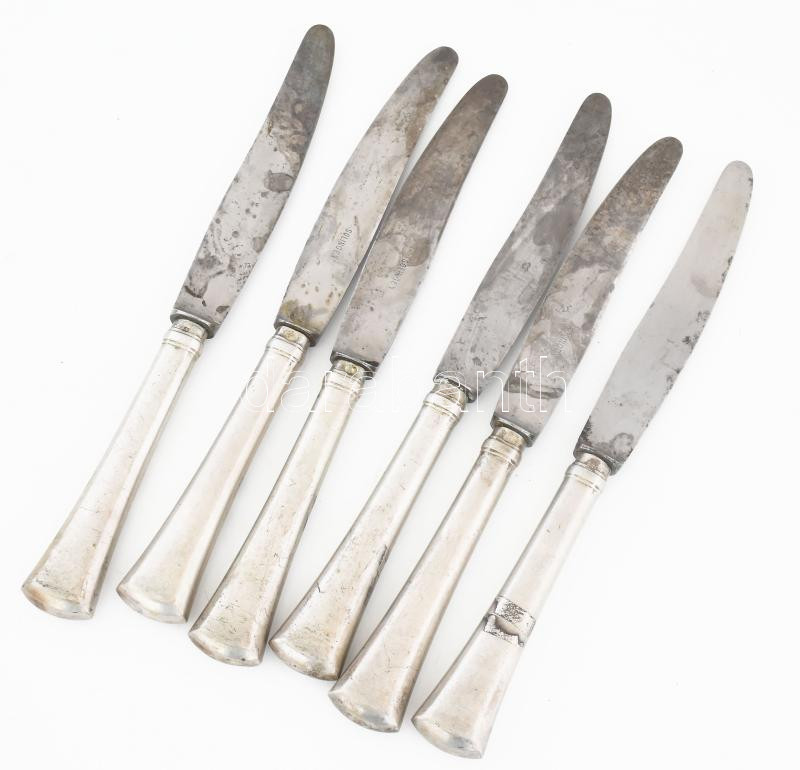 Leírás: 6 db ezüst nyelű kés készletben jelzett dianás, 23 cm