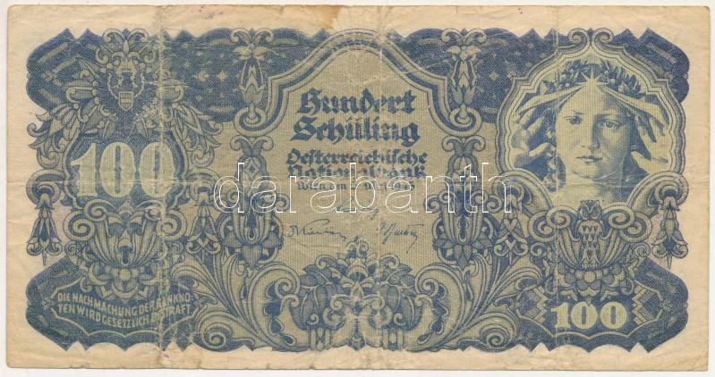 Austria 1945. 100 Schil... https://www.darabanth.com/hu/468-Gyorsarveres/468.0/Numizmatika/Kulfoldi-bankjegyek~500015/Ausztria-1945-100Sch-T-VG-folt-kis-szakadasAustria-1945-100-Schilling-C-VG-spot-small~II3162294