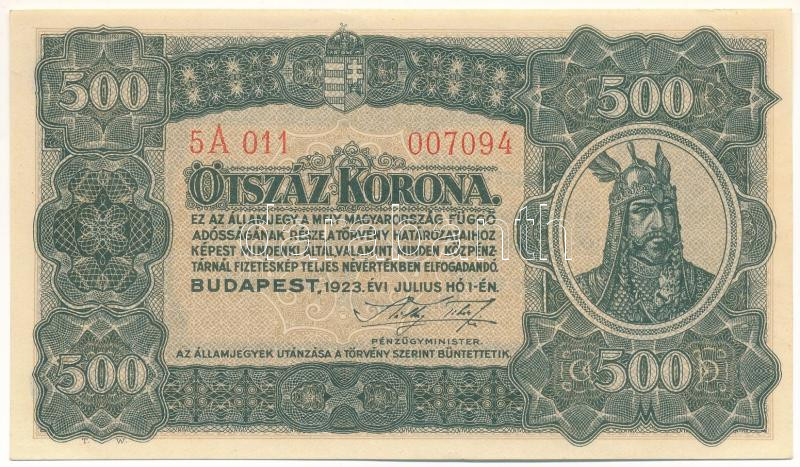 Hungary 1923. 500 Korona "5A 011 007094", without printer's mark C:AU