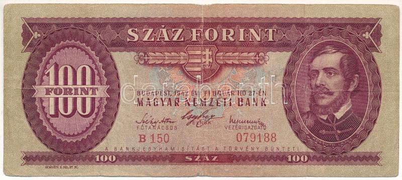1947. 100Ft "B 150 079188" T:F,VG Adamo F27 https://www.darabanth.com/hu/468-Gyorsarveres/468.0/Numizmatika/Magyar-bankjegyek~500008/1947-100Ft-B-150-079188-TF-VG-Adamo-F27~II3162454