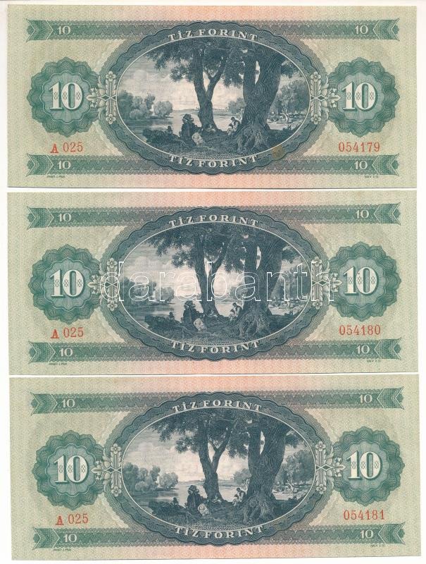 1969. 10Ft (3x) sorszámkövetők "A 025 054179 - A 025 054181" T:UNC,AU ... https://www.darabanth.com/hu/468-Gyorsarveres/468.0/Numizmatika/Magyar-bankjegyek~500008/1969-10Ft-3x-sorszamkovetok-A-025-054179-A-025-054181-T-UNC-AU-egyiken-folt-Adamo-F7~II3162308