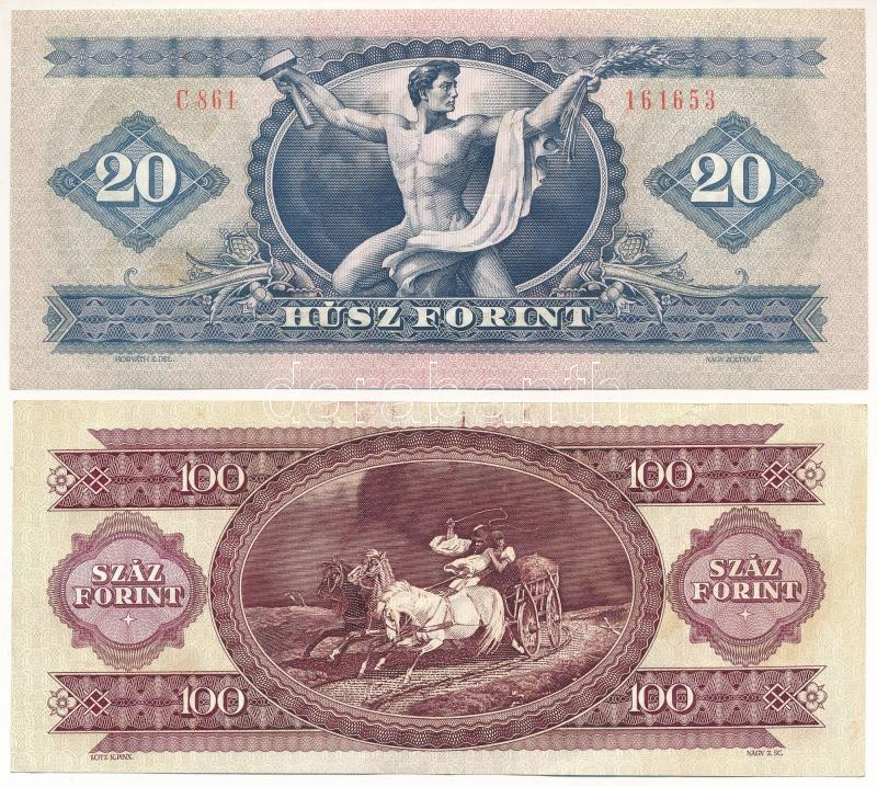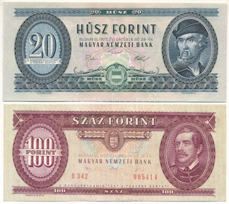 Leírás: 1975. 20Ft eltolódott nyomat + 1992. 100Ft ferde nyomat nyomdai festékfoltokkal T:AU,F szép papír