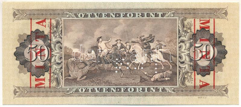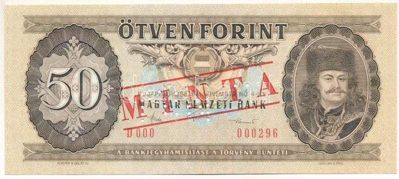 Leírás: 1986. 50Ft "MINTA" perforációval és felülnyomással "D 000 000296" sorszámmal T:UNC hullámos papír Adamo F24Ma